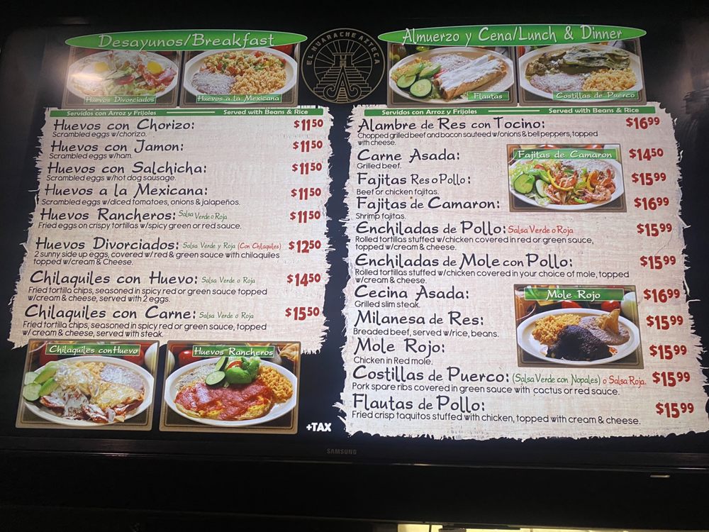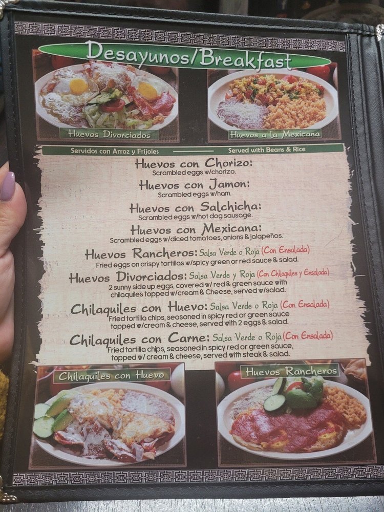 Fried eggs on crispy corn tortillas with spicy green or red tomato sauce. served with rice and beans.